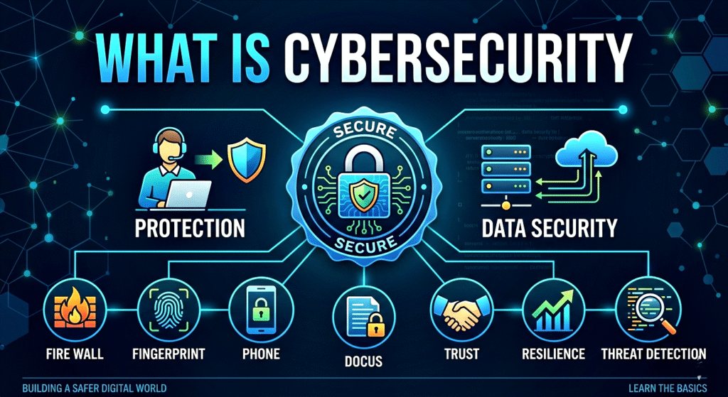 Cybersecurity simply means protecting your devices, personal information, and online activities from hackers and cyber threats. Let’s understand this in a very simple way through five important points.